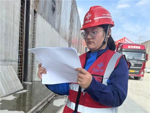 在中交三航局新坝二线船闸项目建设工地上,一位女施工员格外引人注目。她是2024年7月毕业于河海大学港航专业的周丹,现任项目部上游引航道工区施工员。
