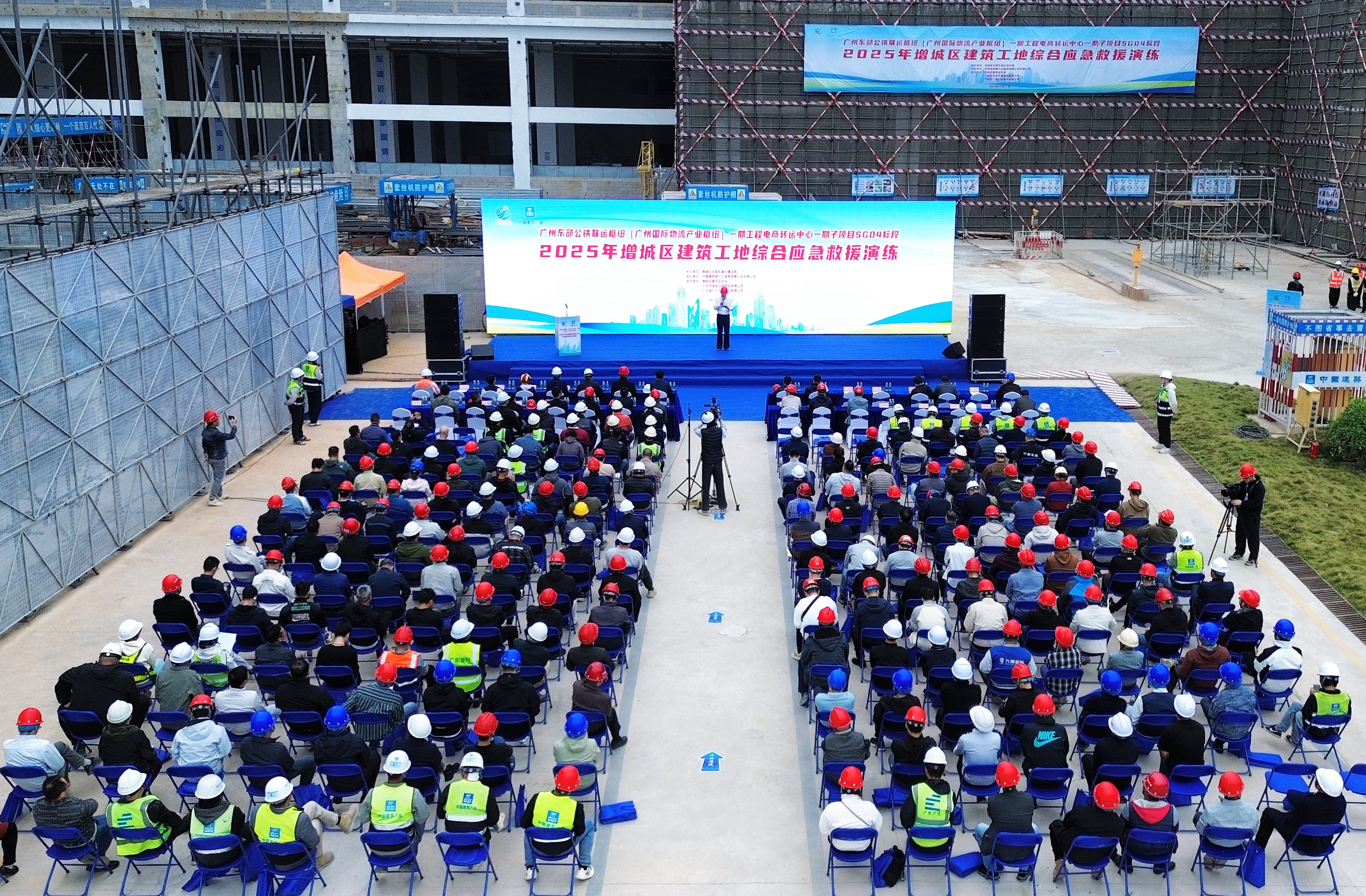 为全面提升房屋建筑工程突发事件应急处置能力,11月18日,2025年增城区建筑工地综合应急救援演练在中建八局广州东部公铁联运枢纽一期SG04标项目成功举行。