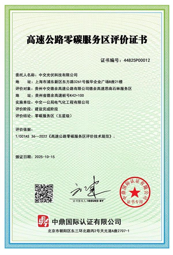 近日,由中交一公局电气化公司参建的德余高速公路思南石林服务区,其分布式光伏电站通过第三方认证,达成“运营期净碳排放为零”目标,获得“高速公路零碳服务区(五星级)..